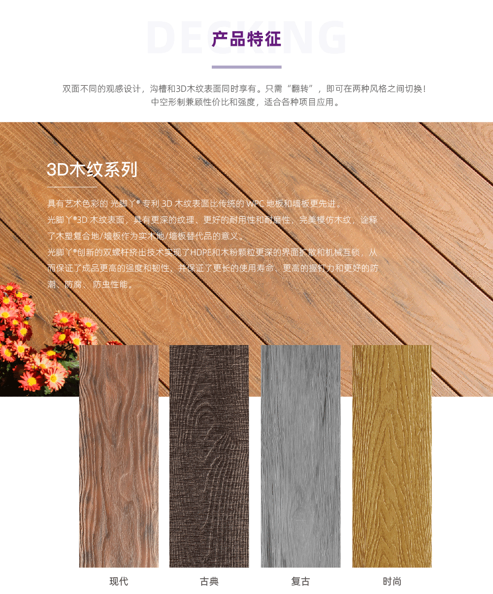 双面不同的观感设计,沟槽和3D木纹表面同时享有。只需“翻转”,即可在两种风格之间切换!