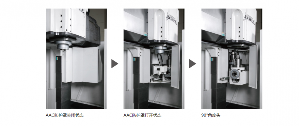 通过自动装卸、ATC的主轴头,可自动进行多面加工。连接在右立柱内侧的AAC装置可自动交换立头和90°角度头。