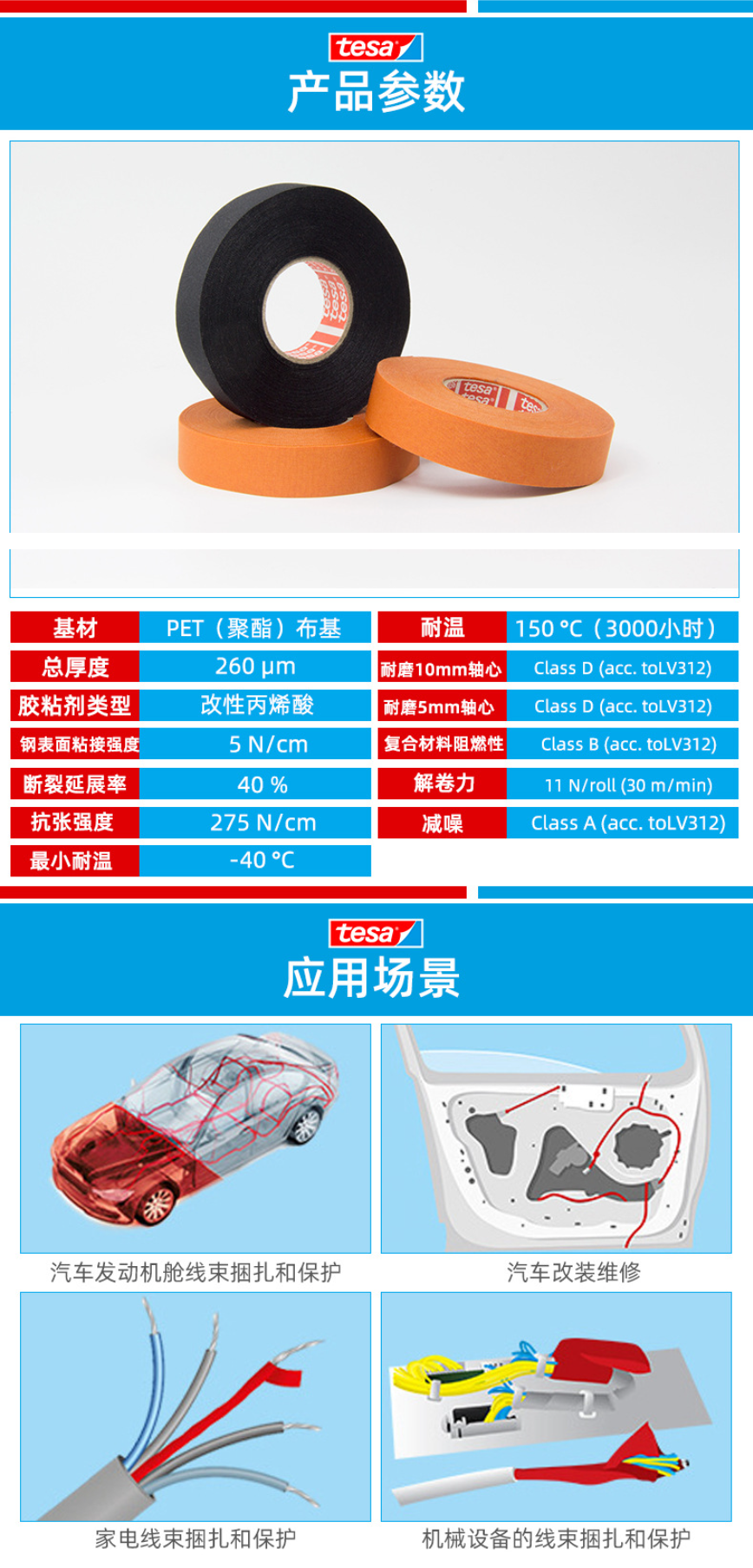 德莎/tesa51026汽车线束布基胶带发动机舱降噪专用耐高温固定捆扎