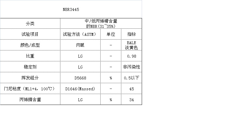 丁腈橡胶3445是一种非污染性,中低门尼粘度和中高丙烯腈聚合物设计,生产率高,弹性性能好。丁腈橡胶3445提供了快速硫化速率,低模具污垢,高回弹。丁腈橡胶3445优选用于模制橡胶部件,如垫圈、填料和O形环。该级还可用于高弹性零件如防振系统、橡胶辊等