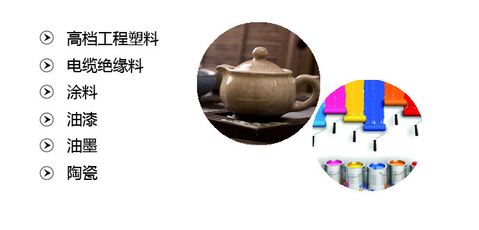 应用:工程塑料、电缆绝缘料、涂料、油漆、油墨以及陶瓷等行业。