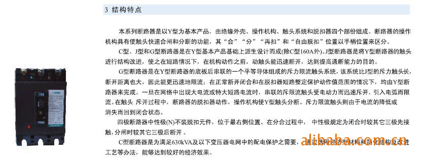 本系列断路器是以y型为基础产品,由透明绝缘外壳、操作机构、触头系统和脱扣器四个部分组成。断路器的操作机构具有使触头快速合闸和分断的功能,其“合”、“分”、“再扣”和“自由脱扣”位置以手柄位置来区分。