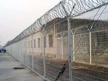 监狱护栏网又称作"Y型安全防御护网"监狱钢网墙,是由V型支架立柱,加强型焊接片网,安全防盗连接件和热镀锌刀片刺笼组成强度和安全防御性级别很高,近年来,被广泛应用在监狱,机场,基地等高安全场所。