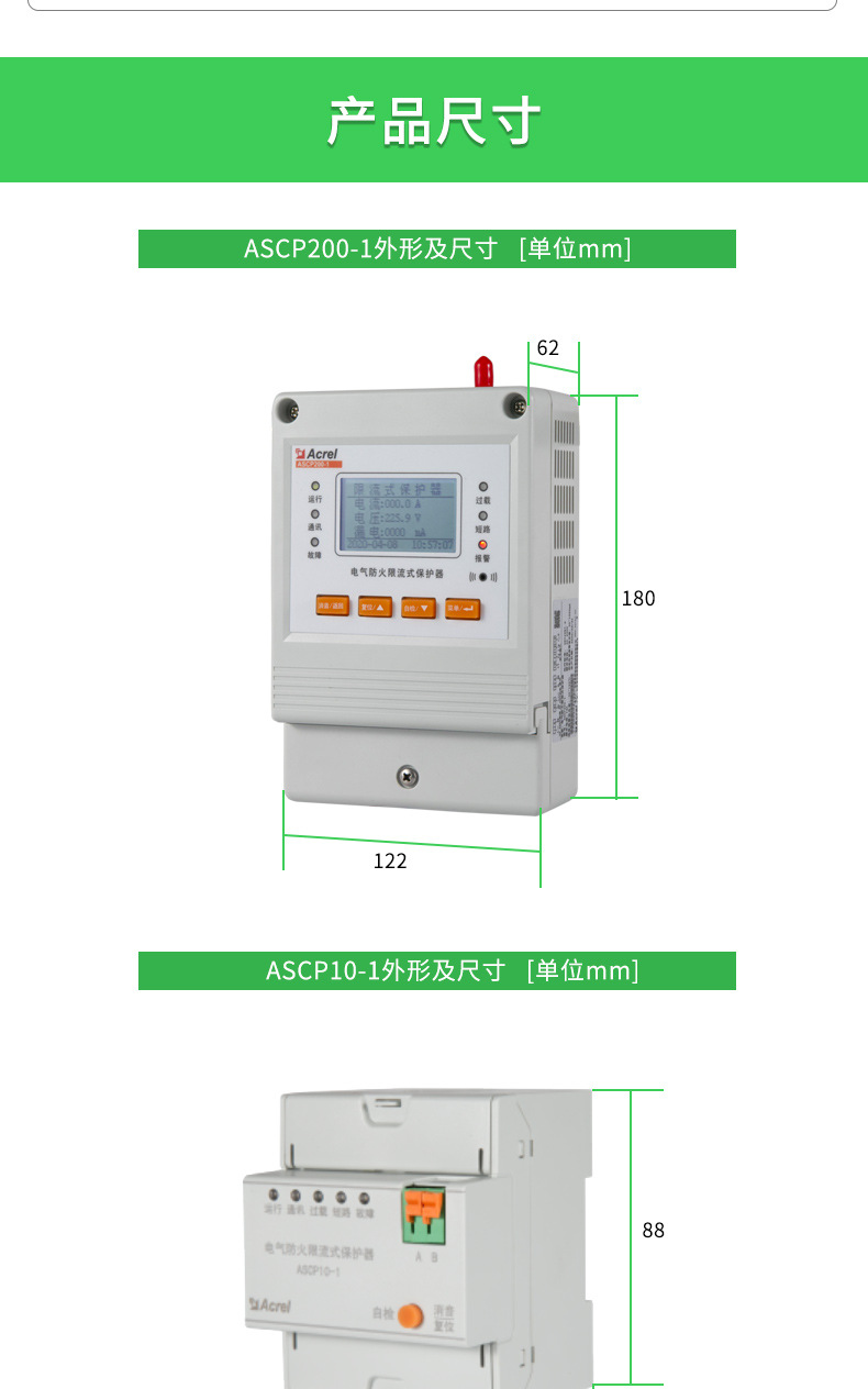 安科瑞ASCP200-20D电气防火限流式保护器 单相限流过载保护可有效克服传统断路器、空气开关和监控设备存在的短路电流大、切断短路电流时间长、短路时产生的电弧火花大,以及使用寿命短等弊端,发生短路故障时,能以微秒级速度快速限制短路电流以实现灭弧保护,从而能显著减少电气火灾事故,保障使用场所人员和财产的安全。