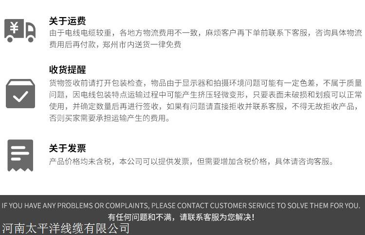 河南太平洋线缆有限公司()是一家专注从事电线电缆生产销售厂家,公司拥有进口生产设备及检测设备,的技术团队,具有较强的新品研发能力。本公司所生产的电缆产品严格按照国标要求生产制造,已形成系列产品有:阻燃电缆系列、耐火电缆系列、低烟无卤电缆系列、矿物质电缆系列等。公司拥有先进的生产设备、检测设备及技术团队,电线电缆规格型号达1000多种,包含:YJV22电缆、YJV电缆、YJLV电缆、YJLV22电缆、YJY电缆等电力电缆。电力电缆,型号规格有单芯、2芯、3芯、4芯、5芯、3+1芯、3+2芯、4+1芯等,其中3+1芯、3+2芯、4+1芯是由两种作用不同的导体组成的,一种叫相线,另一种叫地线,是专门接地用的。横截面积有6mm2、10mm2、16mm2、25mm2、35mm2、50mm2、70mm2、95mm2、120mm2、150mm2、185mm2、240mm2、300mm2 、400mm2 等。