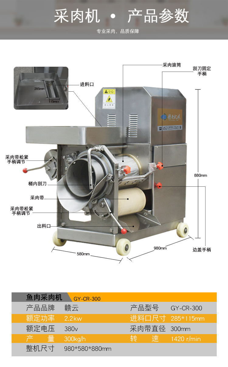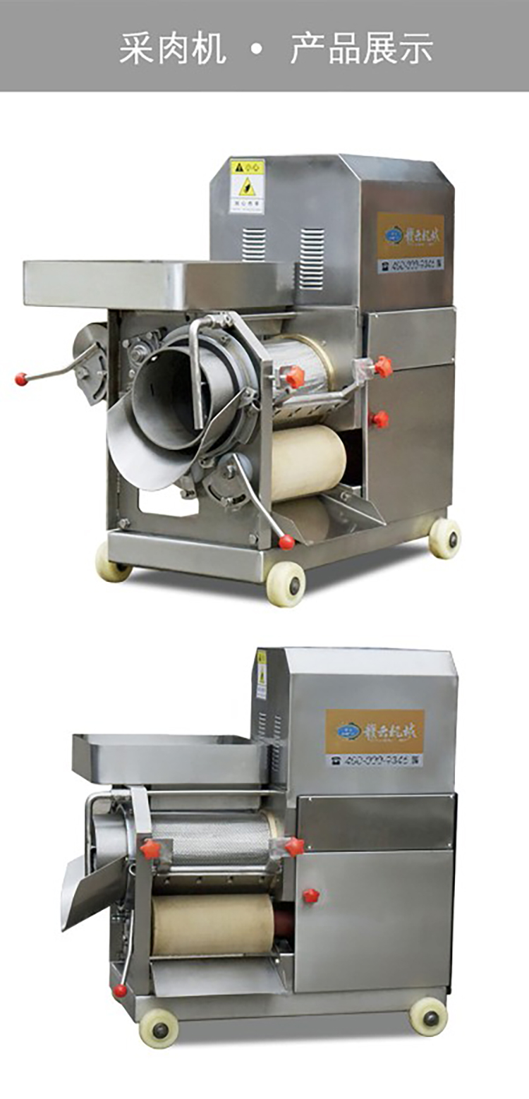 鱼肉分离机简介:赣云牌鱼肉分离机又称之为鱼肉采肉机、鱼糜采取机、虾壳分离机、去鱼骨机、泥鳅采肉机、去鱼刺机,通过挤压原理将鱼肉和鱼骨等分离开来,鱼肉采肉前需浆活鱼去头部和内脏。赣云牌鱼肉分离机有普通材质和不锈钢材质,普通材质鱼肉分离机有两种型号,分别是GY-CR-160型和GY-CR-200型,不锈钢材质鱼肉分离机有两种型号,分别是GY-CR-200型和GY-CR-300型。下面,我来为您详细介绍赣云300型鱼肉采肉机采用全机身不锈钢制造,产品美观,方便清洗;