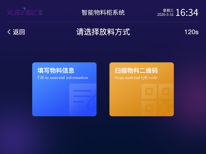 2)主柜带有一个12寸的电容触控一体机和嵌入式扫码器,使用者可以是存件人和取件人,不同身份的使用者面对该智能称重物料柜可以独立完成操作。屏幕界面初步设计效果图如下图所示: