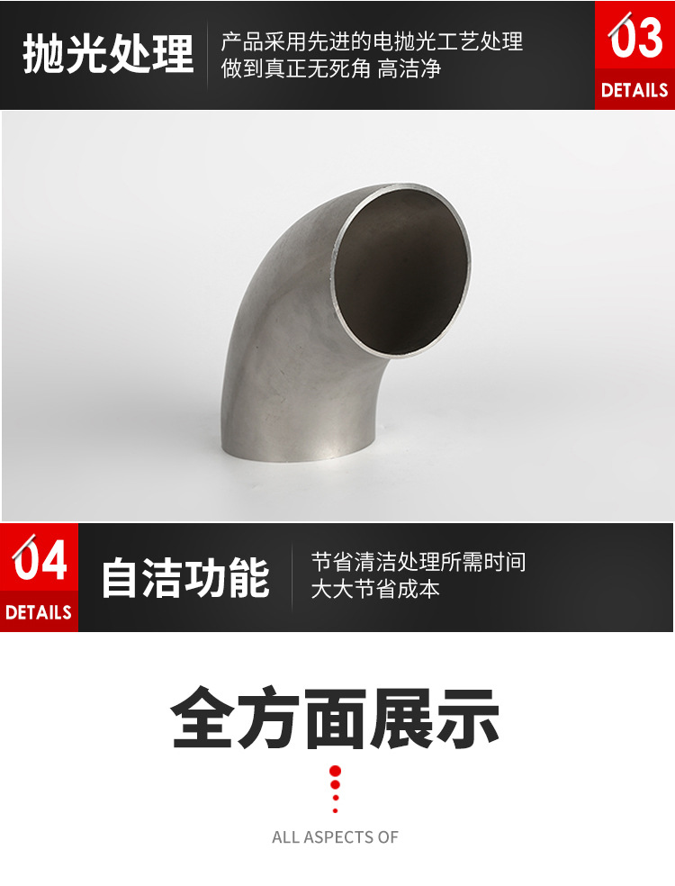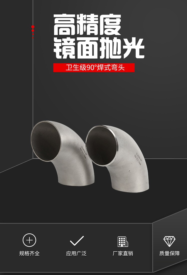 卫生级90度不锈钢焊接弯头内外用镜面抛光处理,表面精密度达到满足食品级要求;卫生级不锈钢弯头广泛应用于乳品、食品饮料、啤酒、生物制药及日用化工等工业领域。