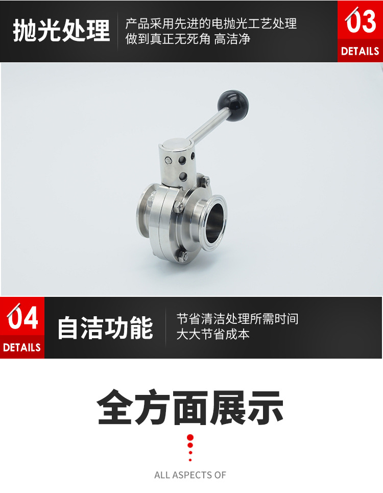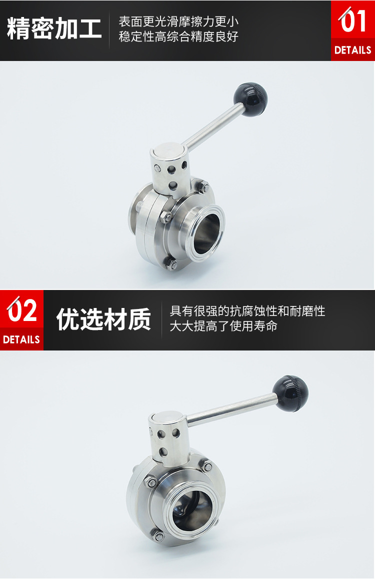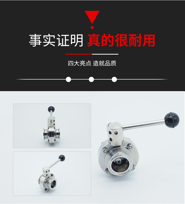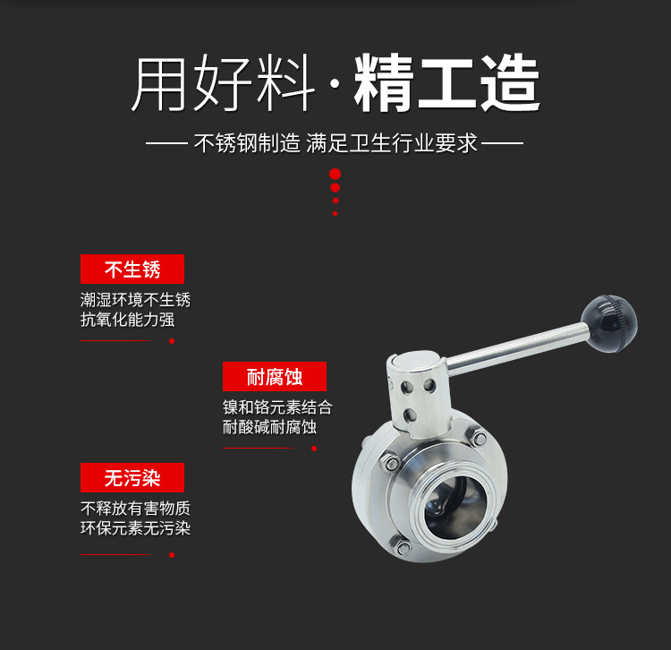 卫生级快装蝶阀不仅结构简单、体积小、重量轻、材料耗用省,安装尺寸小、而且驱动力矩小,操作简便、迅速,并且还可同时具有良好的流量调节功能和关闭密封特性。卫生级手动快装蝶阀在完全开启时,具有较小的流阻,当开启在大约15°至70°之间时,又能进行灵敏的流量控制,因而在大口径的调节领域,蝶阀的应用非常普遍;卫生级手动快装蝶阀阀板的运动带有擦拭性,因而该焊接蝶阀可用于带悬浮固定颗粒的介质,依据密封件的强度也可用于粉状和颗粒状介质。