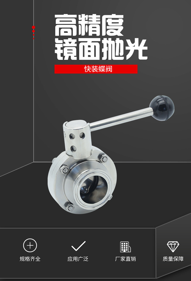 快装卫生级蝶阀不仅结构简单、体积小、重量轻、材料耗用省,安装尺寸小、而且驱动力矩小,操作简便、迅速,并且还可同时具有良好的流量调节功能和关闭密封特性,启闭件往复回转90°左右来开启、关闭和调节流体通道的一种阀门。