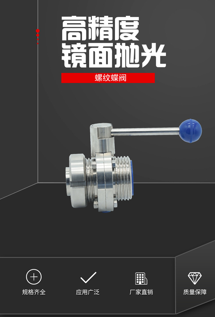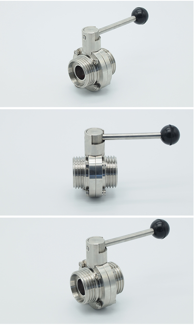 卫生级螺纹蝶阀的启闭件往复回转90°左右来开启、关闭和调节流体通道的一种阀门。