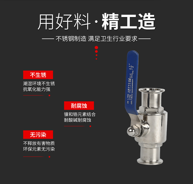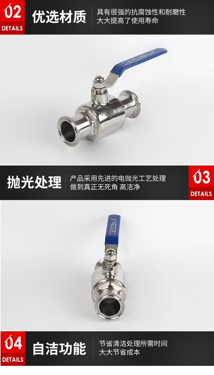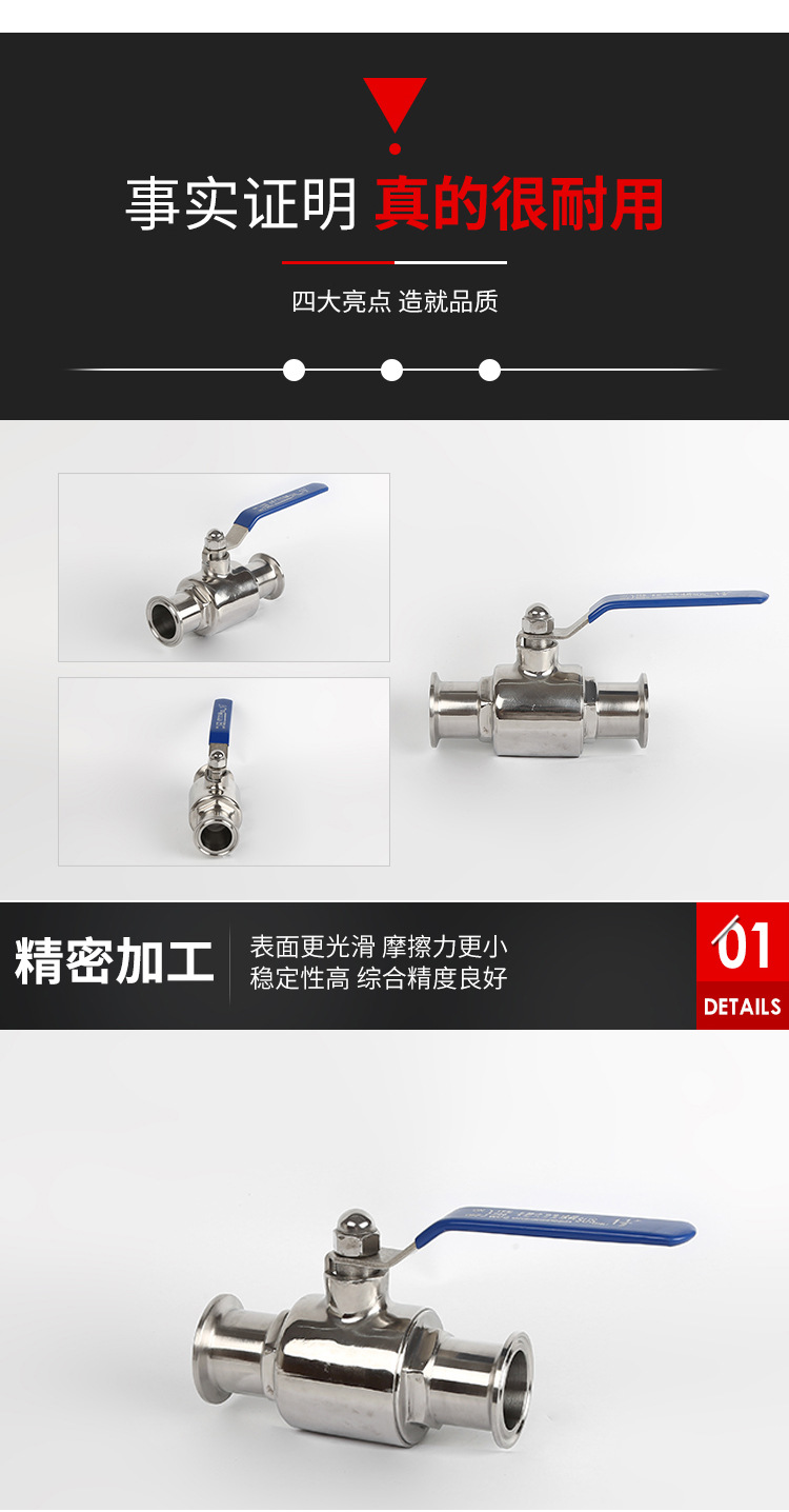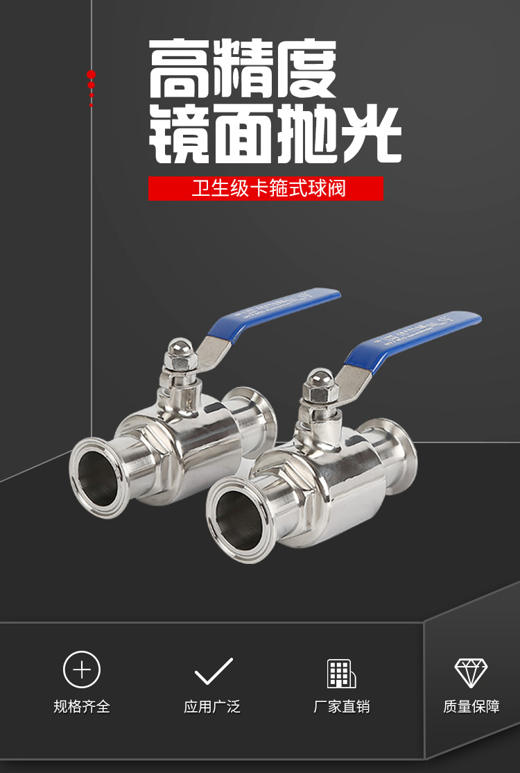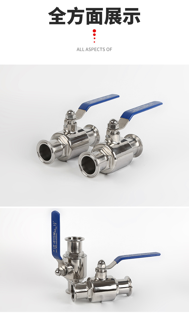 卫生级快装球阀采用卡箍式,具有结构简单、造型美观、装拆快捷,开关迅速,操作灵活,流体阻力小,使用安全可靠等优点。可配气动执行器及电动执行器。