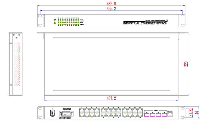 RS328G系列是一款非网管全千兆工业以太网交换机,支持24个10/100/1000Base-T(X)电口,4个千兆SFP扩展槽。RS328G遵循工业设计标准,低功耗高效率,采用工业无风扇散热模式,外壳使用铝合金型材,使产品轻巧、坚固、耐腐蚀、抗电磁干扰能力更强,工作温度-40~75℃,标准1U机架式安装,支持85~265V AC/DC电源输入,提供过流,过压,短路和过热等工业级电源保护,主要用于工业现场控制设备PLC,工控机及其他现场控制设备的高密度连接。目前该产品广泛应用于智能交通,能源风电,管廊隧道,智能制造等工业恶劣环境。RJ45接口自动流速控制,全双工/半双工模式、MDI/MDI-X自动侦测。