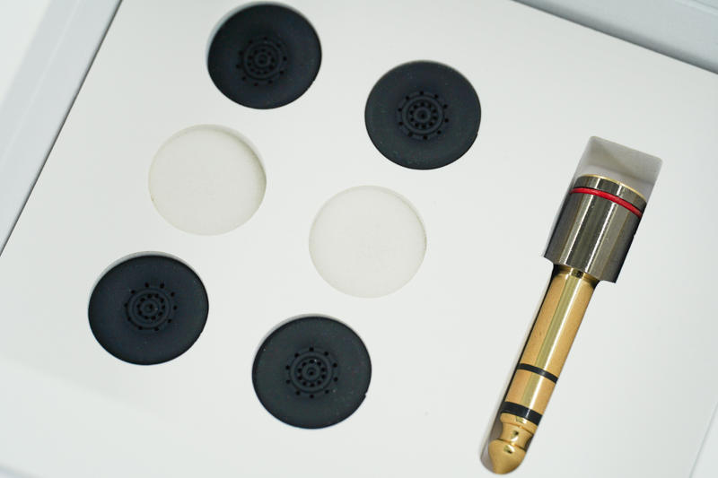 提供给用户的耳套比较特殊,中间白色的实心海绵不用多说了,两侧黑色的居然是硅胶耳套,平头塞上的硅胶耳套,这我是头一次见到,边上则放置着一个3.5转6.5的转接头。