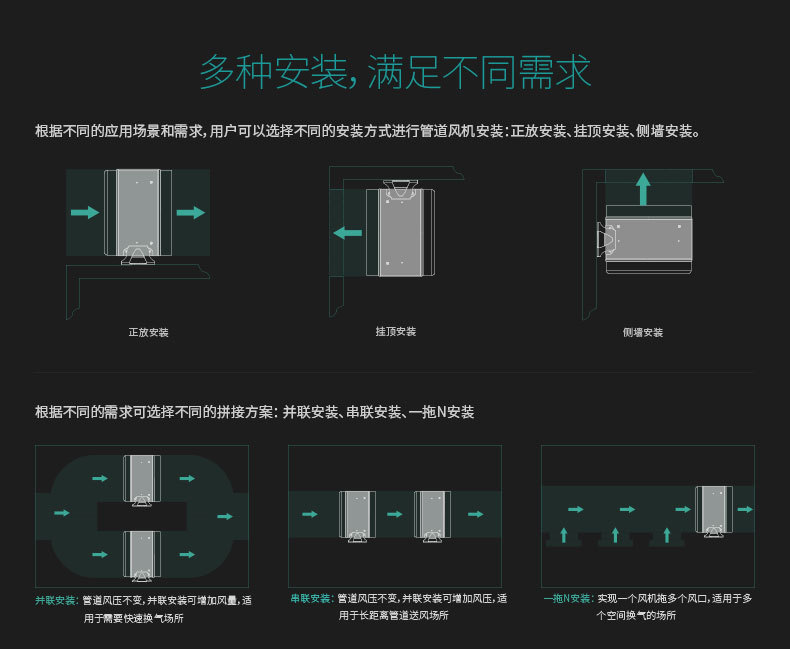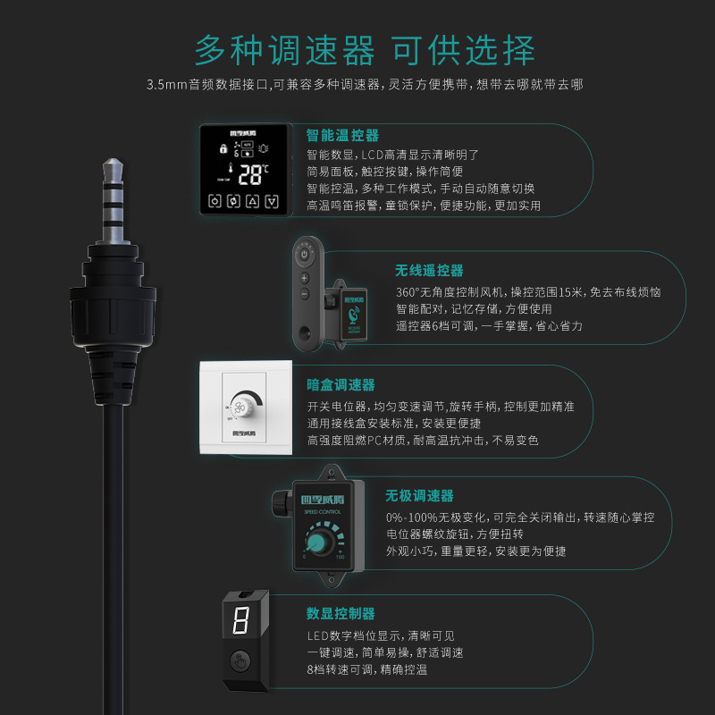 全新一代直流变频风机叶片采用环保的材料,外壳采用冷轧钢的材料,小巧的机身便于安装在狭小的空间内,可以在不同的环境中运用,消耗功率也仅为普通交流马达的一半,起到了节能的效果,还增加了智能强化稳流技术,有过压过流保护、锁机保护以及软启动的功能,降低了风机损坏的机率。直流变频风机可以支持多种类型的调速器:智能温控器、无线控制器、数显控制器等,其中智能温控器能够实现智能控制室内温度,起到自动调节风量、风速等方面的作用,更好地起到室内恒温的效果,无线控制器可以方便用户进行调节,省心省力。