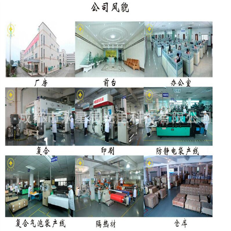 本公司生产屏蔽袋、铝箔袋、防静电袋、尼龙袋、PE塑料袋,网格袋、导电袋、镀铝袋、气泡袋、纯铝复合袋、镀铝膜袋,复合气泡袋、珍珠棉覆膜袋(珍珠棉复膜袋)、邮政快递袋、牛皮纸气泡袋,奶白膜复合气泡袋、珠光膜气泡袋、镀铝膜气泡袋,网格膜复合气泡袋,屏蔽膜气泡袋、导电膜气泡袋、EPE珍珠棉,白色珍珠棉、红色珍珠棉、黑色珍珠棉、隔热材料,保温材料、双铝单泡隔热材料、双铝双泡隔热材料、双层纳米气囊反射层、单层纳米气囊反射层、热网管道保温反射层隔热材料、铝箔气泡隔热材料、防腐保温材料、包装袋,防潮袋,防水袋,抽真空袋、铝袋,塑料袋、缓冲保护袋,黑色气泡膜袋,黄色牛皮纸复合气泡袋,彩色汽泡膜袋,可透视袋,避光/遮光袋,白色气泡膜袋,ESD袋,银灰色静电袋,电子产品包装袋,网格导电袋、CPE流延膜袋/CPP袋,等各种包装材料。年设计生产销售额5千万人民币。