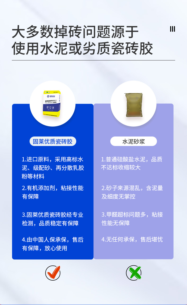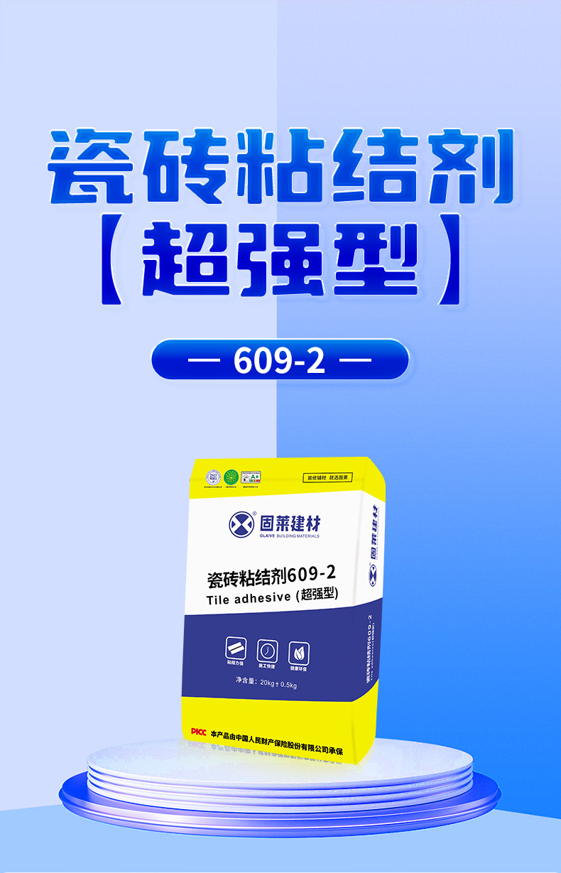 固莱瓷砖粘结剂609-2是一种高品质环保型聚合物改性的水泥基复合粘结材料,是由高标水泥、级配砂、再分散乳胶粉和其它添加剂等配制而成。施工方便快捷,轻松解决瓷砖空鼓脱落。