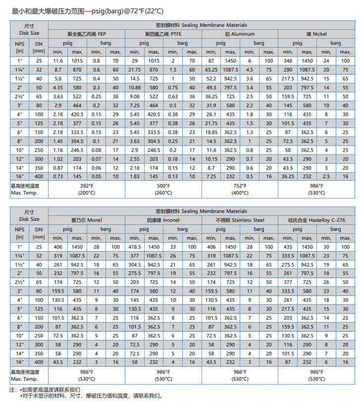 爆破片温度:小于260℃,因使用工况为腐蚀性介质,密封膜材质不适合用金属如铝膜和不锈钢膜。