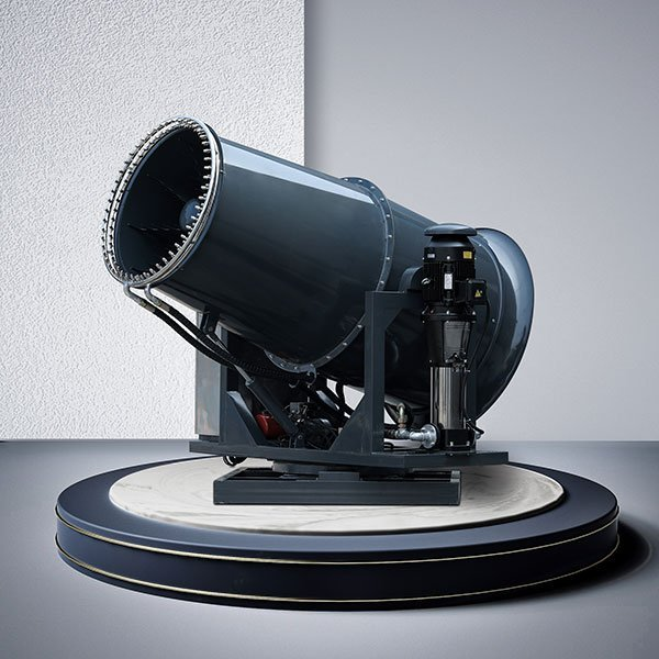 60米工业雾炮机的工作原理是通过高压水泵将水送入雾化喷嘴,形成细小水雾,再由高速风机扩散至空气中,与悬浮颗粒物结合后沉降,达到降尘效果。
