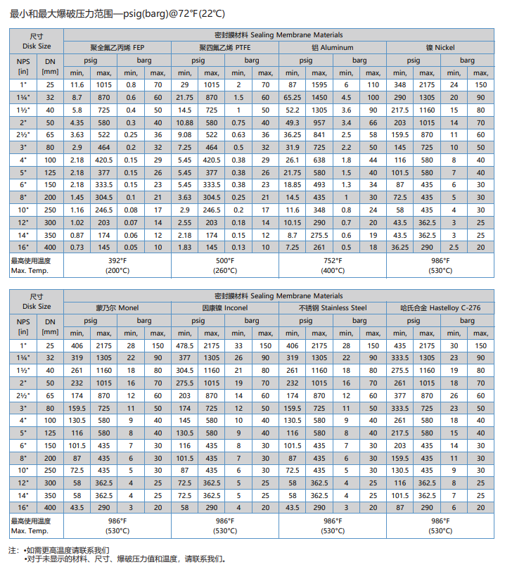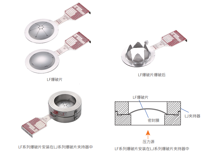 当容器或者系统内压力过高时,爆破片受压产生拉伸应力破坏,膜片破裂泄放出容器或系统内多余的压力,从而保护设备的安全。