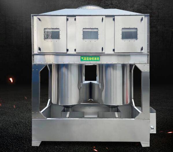 含尘废气由风管引入喷淋塔,经过旋转洗涤桶时,风带加快,带动填料球飞带运转,在洗涤桶里,含尘废气与水雾充份混合洗涤、中和反应(水里面补充有酸碱时),废气经过净化后,在经除雾层脱水除雾后由风机排入大气或在进入其他净化设备(UV紫光光氧催化、低温等离子等)、吸入液在塔底经水泵增压后在箱顶喷淋雾化而下,回流至箱底循环使用。净化后的废气达到国家排放标准。