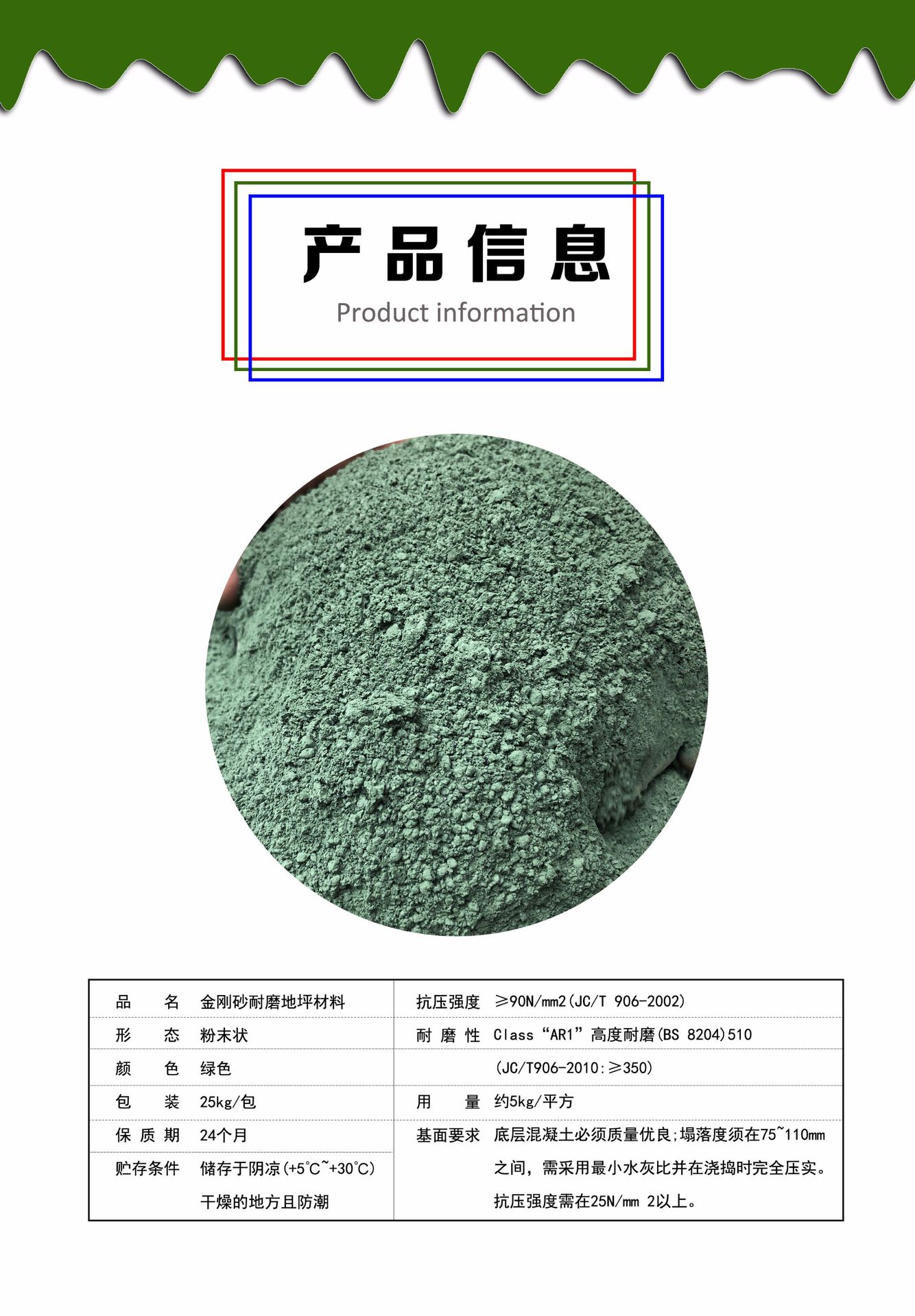 金刚砂耐磨地面材料由耐磨损骨料同水泥,添加剂等组成,预拌生产,配比严格控制、质量稳定,在工地直接应用。金刚砂地面材料利用干洒式施工,与混凝土基层整体固化后,在地面上形成一层密实坚硬,高 度耐磨损,防尘的面层。
