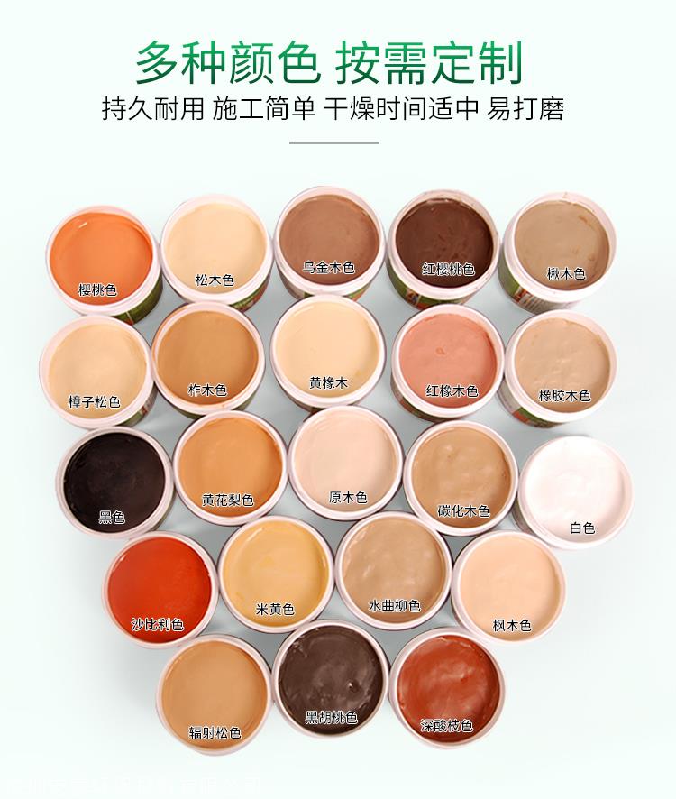 汉林水性修补腻子的常用颜色有:水曲柳、红酸枝、楸木、榉木、枫木、红橡木、黑胡桃、柞木、松木、樟子松、辐射松、红木、花梨木、炭黑色、乌金木等50余种颜色,附着力强、不脱落,不开裂,不下陷,不起包,干燥快。易打磨 等特点: