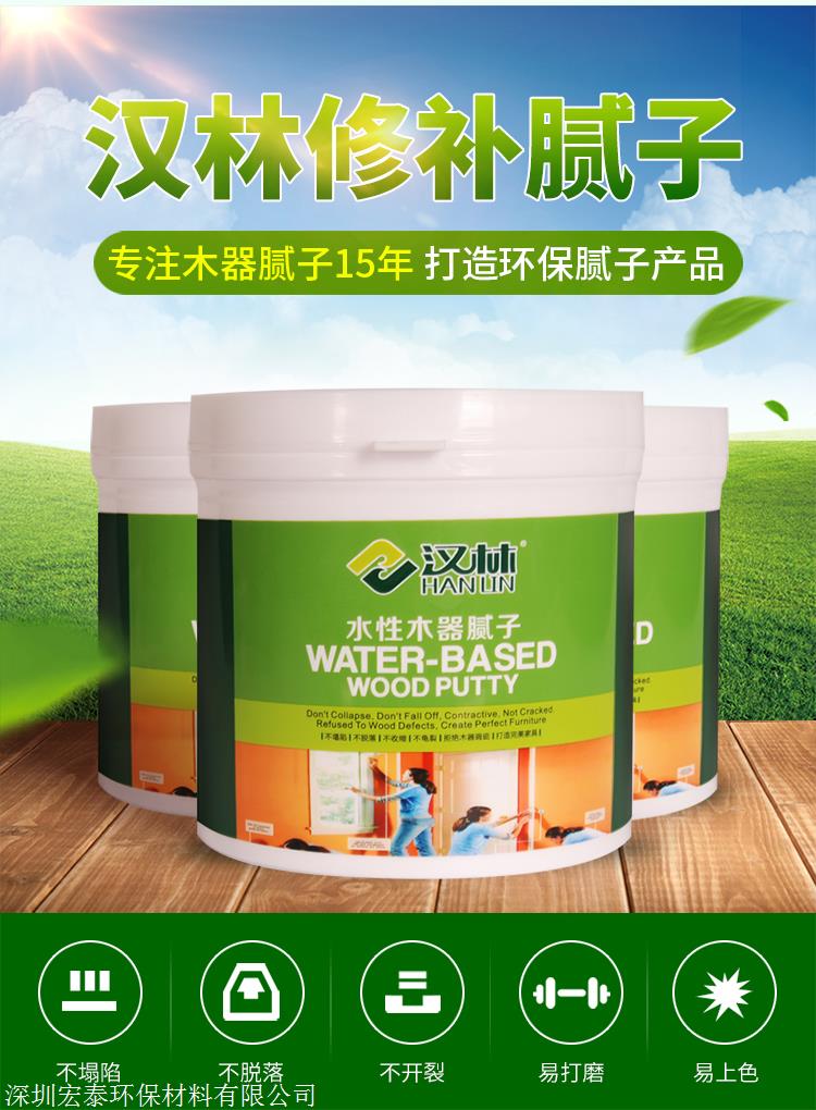 汉林多功能水性修补腻子低气味、污染小;因为是水性涂料,没有毒,可与木器漆和油漆同时使用。