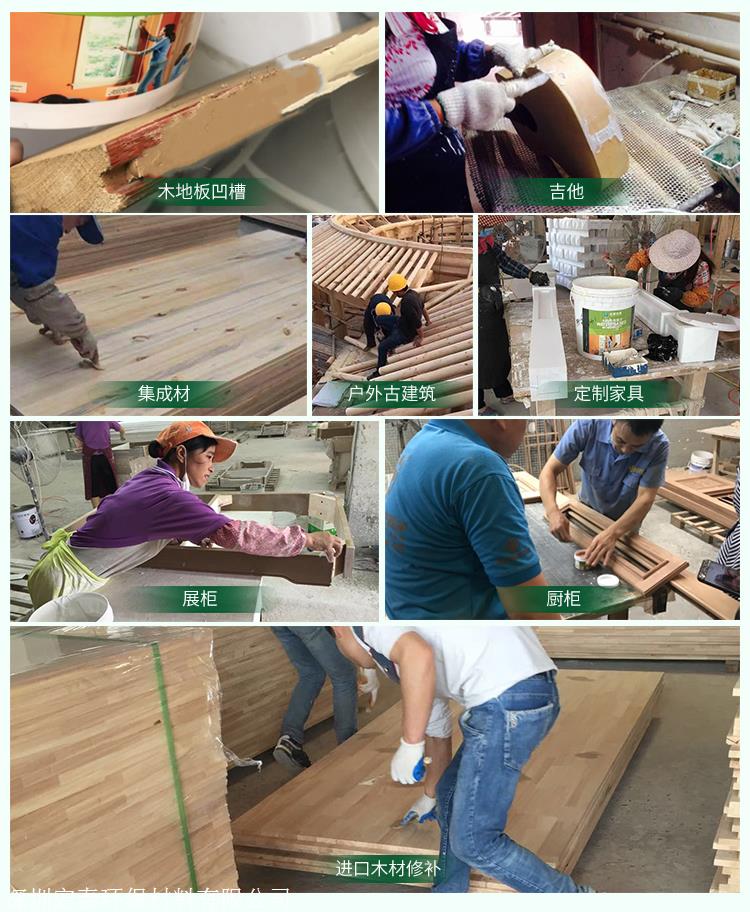 1、适合木器缺陷填补,填补钉眼,虫眼,节疤,拼缝,接口效果明显! 2、替代原子灰,进口水性腻子,油性腻子,502木屑等产品。有效提高工作效率! 3、常规颜色20多种,满足不同木材需求!木材颜色相似度90%。 4、腻子光滑细腻、封闭性好、宜刮宜擦,施工方便。易于打磨、浪费少、可回收使用。 5、附着力强、不脱落。干燥快。与任何木器漆相融、无排斥。