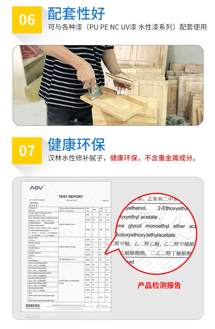 4.多功能水性修补腻子特点:环保、不塌陷、不开裂,干燥快,成品腻子,无需添加固化剂或稀释剂。不含重金属、甲醛等限量物质。