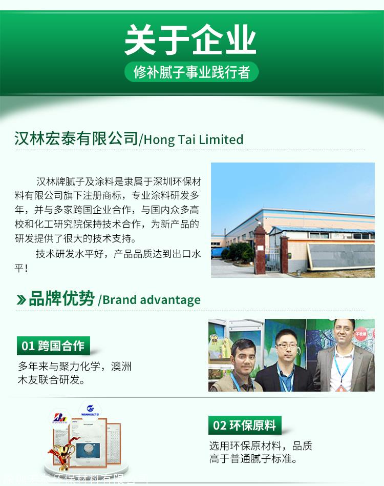 深圳宏泰环保材料有限公司直专注于水性修补腻子研发生产技术,与杜邦、拜耳、巴斯夫、罗门哈斯等多家跨国化工企业在原料供应、技术支持等领域保持着良好的合作关系,并与国内众多知名高校和化工研究院所保持技术合作,为新产品的研发提供了强大的技术支持,技术研发水平一直居于行业前沿,产品达到国际水平!产品独特的配方设计,沿澳洲生产工艺,性能达到高填充,不开裂,不下陷,不鼓包,好打磨,易着色的特点。汉林多功能水性修补腻子是木质家具和木器上漆前不可或缺的产品,在底漆前一道工序直接刮涂于木胚表面,可填平被涂物体表面的高低不平,采用水性树脂、助剂、颜料、填料乳化而成。可以填补家具、木板局部有凹陷的地方,也可以全部表面刮涂,可以用在封闭底漆上面,也可以用在木板上面。