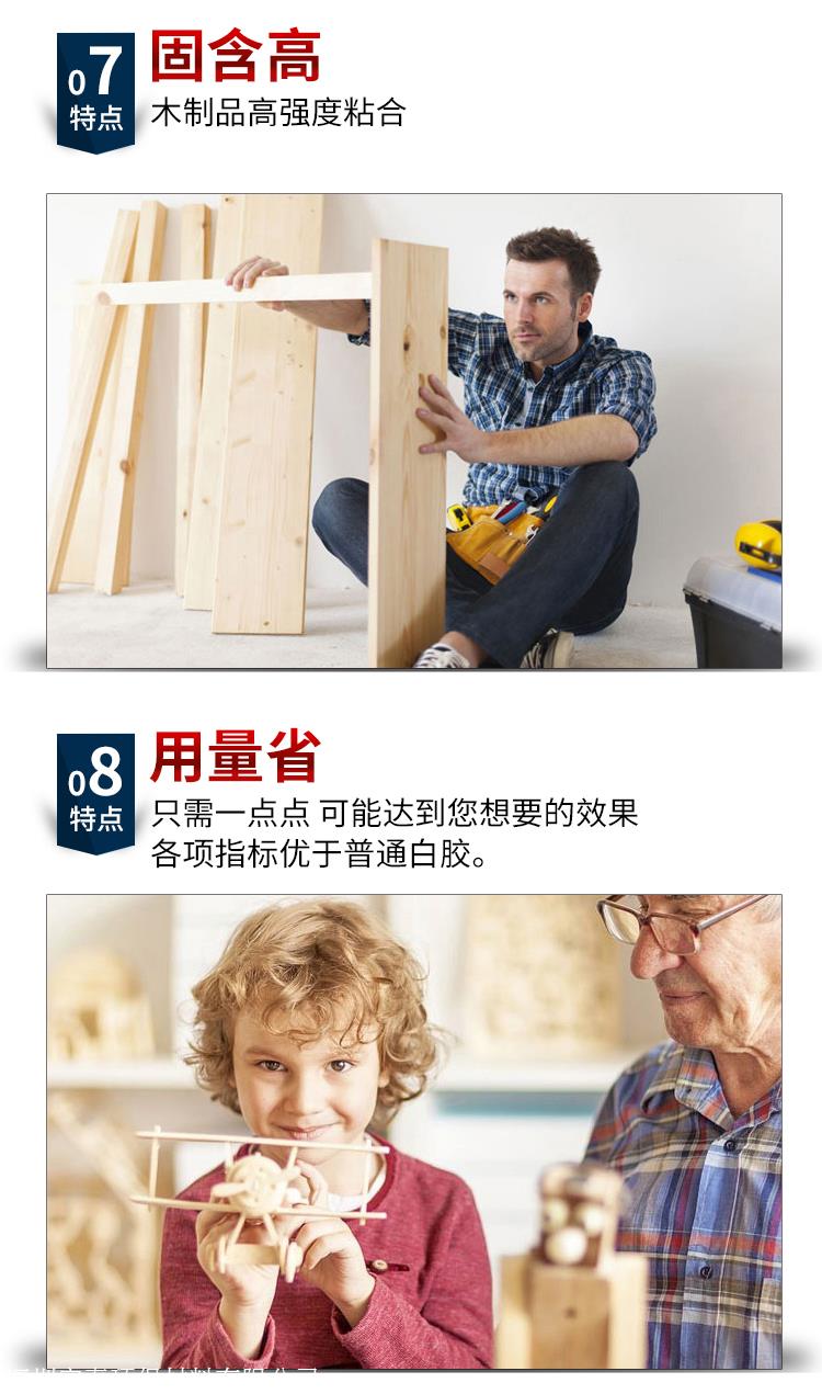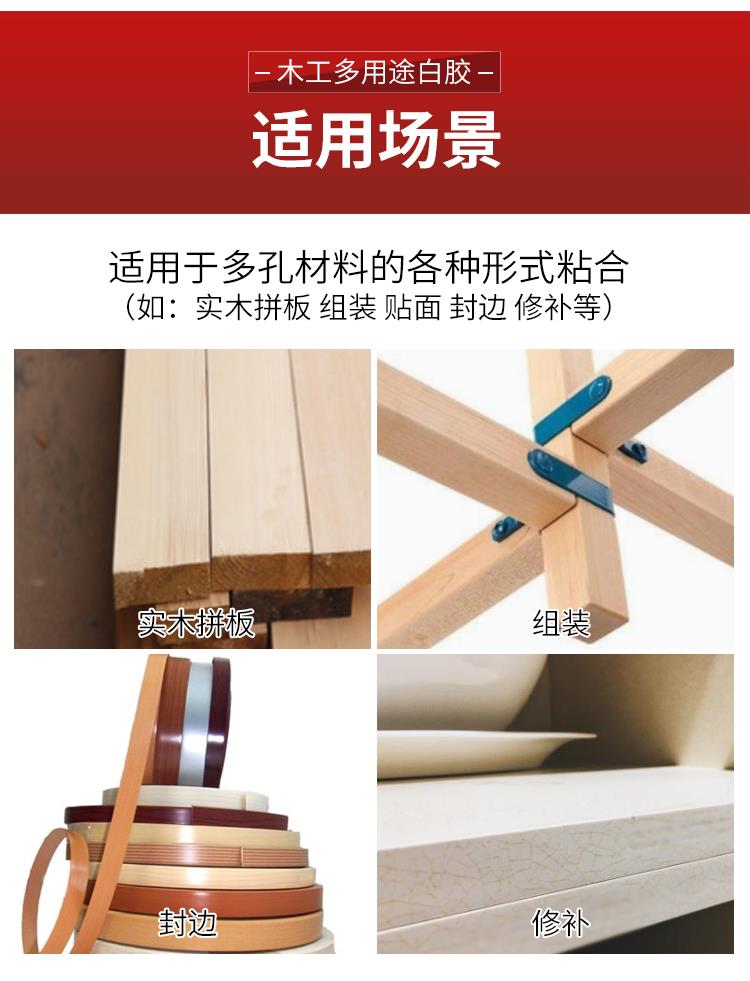主要用途:各种木器、板材、纸张、皮革等多孔材料的粘合,如拼板、组装、修补、贴面封边等。