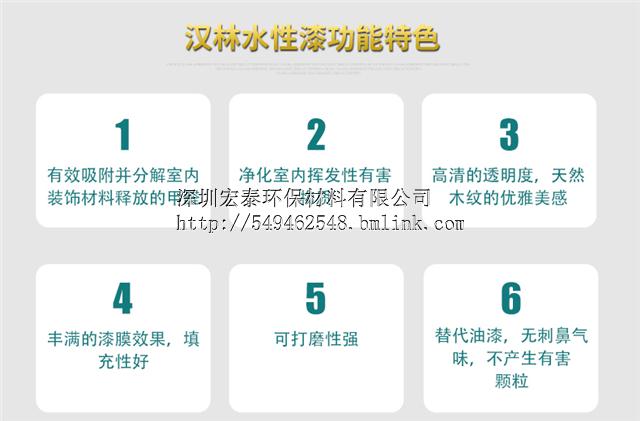 汉林水性木器漆:(水性家具漆)本产品采用水性涂料制备技术与先进水性树脂体系,添加了纳米净味因子,能有效吸附并分解室内装饰材料和板材释放的甲醛,净化苯类,酯类,酮类等各种挥发性有害物质,能营造空气持久森态清新的居住环境,在施工过程或施工后都不会产生刺激性气味,加倍呵护家人健康。