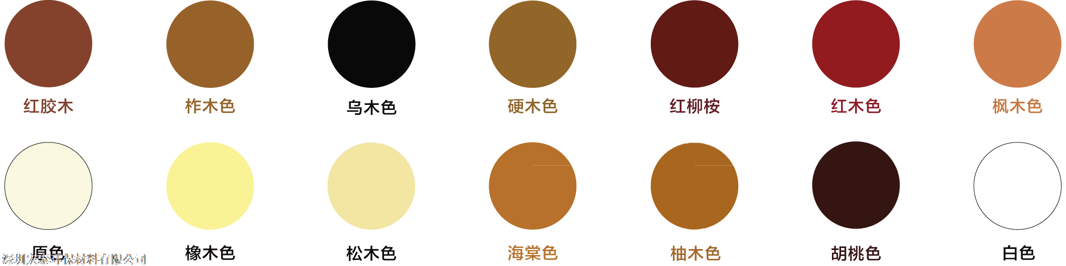 产品颜色 :Timbermate 木友填料有:红橡色、红柳桉色、乌木色、红木色、枫木色、橡木色、原色、松木色、柚木色、白色、胡桃色、辐射松色、红胶木色、硬木共14 种颜色,它们之间可以互相调配出很多种颜色及加入水性色浆调出所需的颜色。