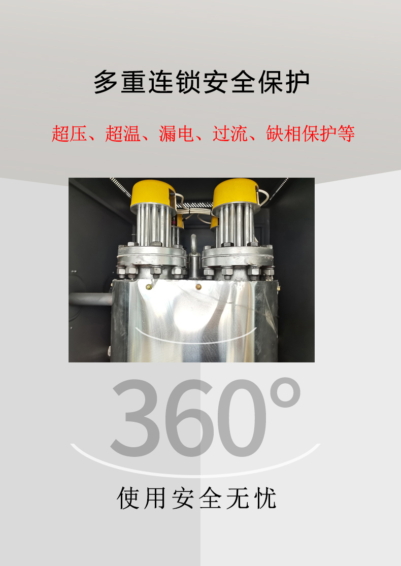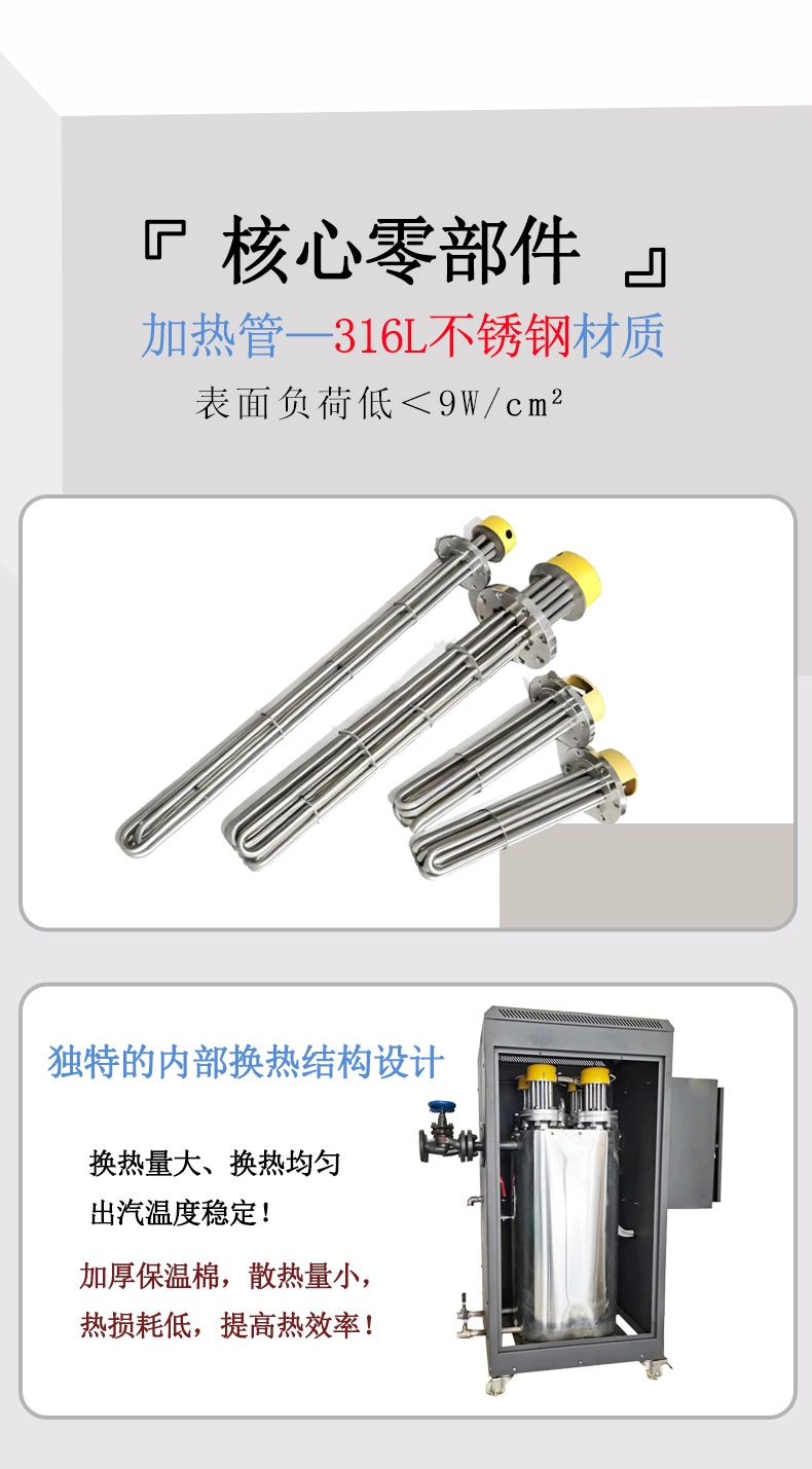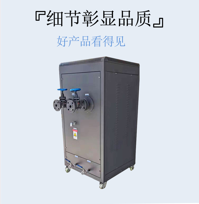 采用立式结构设计,内部结构合理。结构紧凑,无需建造复杂的燃烧器、烟囱和燃料供应管道,安装灵活,大幅度节省空间。安装简便,只需连接蒸汽管道和电源即可,大大降低了安装难度和成本。可模块化设计,便于多台并联使用,外壳采用数控切割和数控折边一次成型工艺,做工精细;外壳表面经过高温喷塑处理,经久耐用。