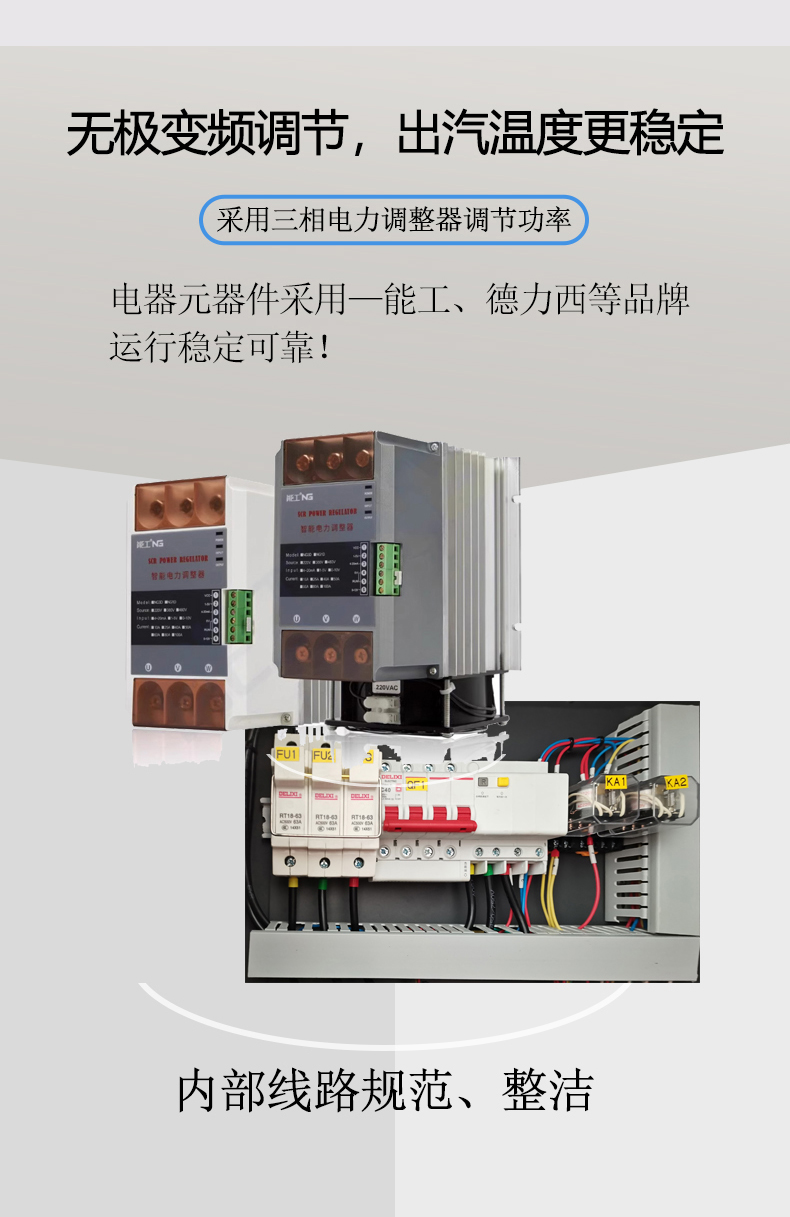 采用先进的PID控制,控制精度高,响应迅速。电加热元件的热惯性小,通电即加热,断电即停止,能够迅速响应蒸汽流量或设定温度的变化。将出口温度转化成4-20ma到电力调整器,调节运行电功率。根据当前温度和目标温度的大小自动调节加热功率,整个加热功率实现线性调节。可以轻松实现加热功率的0%-100%无级调节,从而在不同负载下都能稳定输出目标温度的蒸汽。可以对过热蒸汽的最终温度进行的控制(精度可达±1℃),这对于温度敏感的工艺(如制药、材料加工)至关重要。