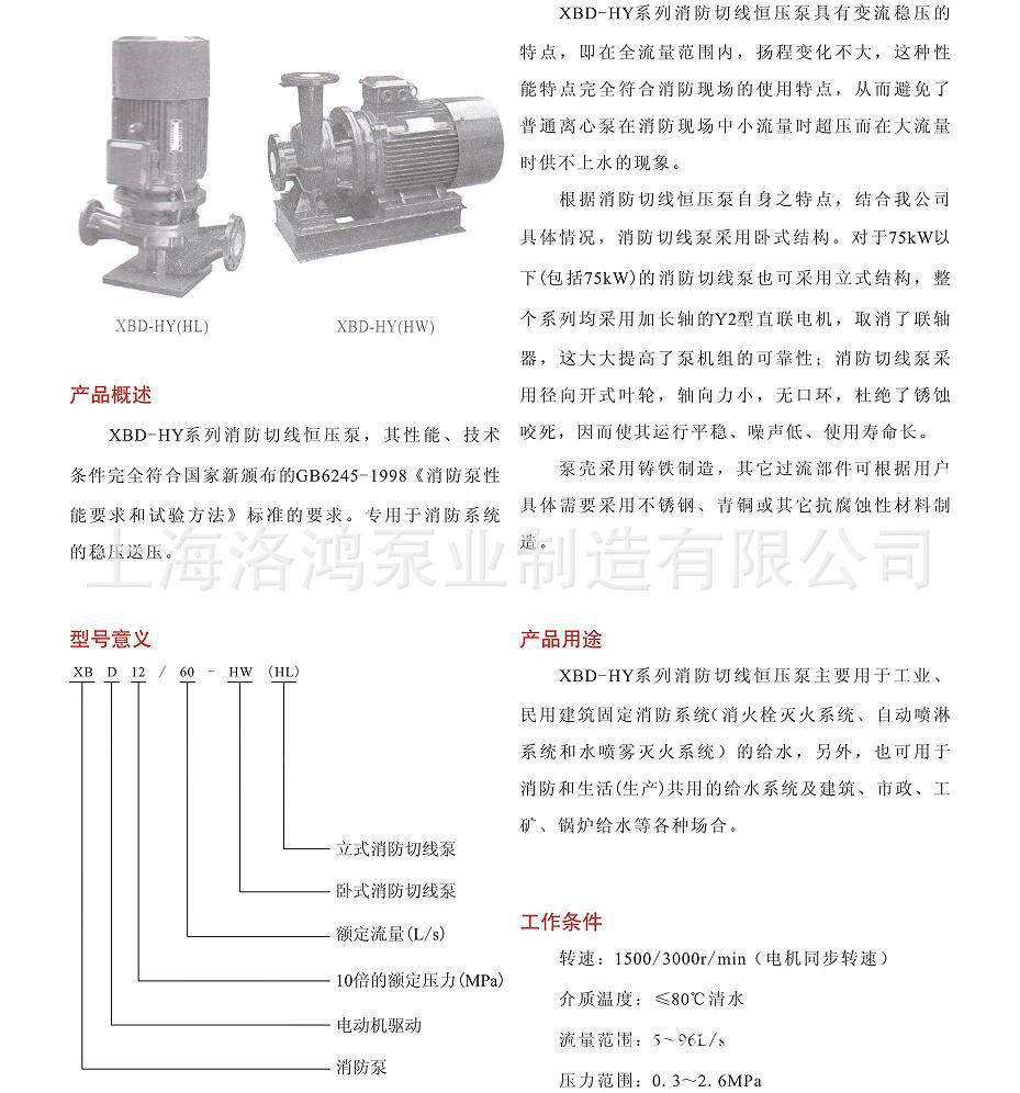 恒压消防泵适用于高层建筑消防给水和生活供水的恒压水泵,是可靠,高品质的消防专用泵。完全符合国家标准GB6245-1998《消防泵性能要求和试验方法》和满足现行消防防火规范要求并通过“国家消防装备质量监督检验中心”检测