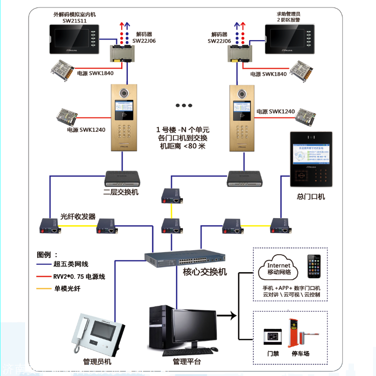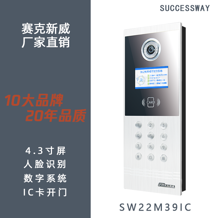 SW2221系统门口机采用数模融合设计、安卓操作系统,具备人脸(本机存储)、指纹、刷卡、密码开锁,手机APP可视对讲及开锁、广告播放等功能;门口机摄像头采用720P数模双输出,图像清晰;外联网采用数字产品,光纤联网;单元内采用CAN总线网线传输,信号抗干扰能力强,单主线可靠传输距离可达200米,接入线可达50米,图像清晰;室内机采用外解码设计,带2防区报警,电源配置经济,系统总体造价低。单元内18V直流供电,门口机内置IC卡读头,12V直流单独供电,可以直接驱动磁力锁。系统电源、门口机和层间设备都有防错接、防短路保护设计,大大提高了产品的安全性。