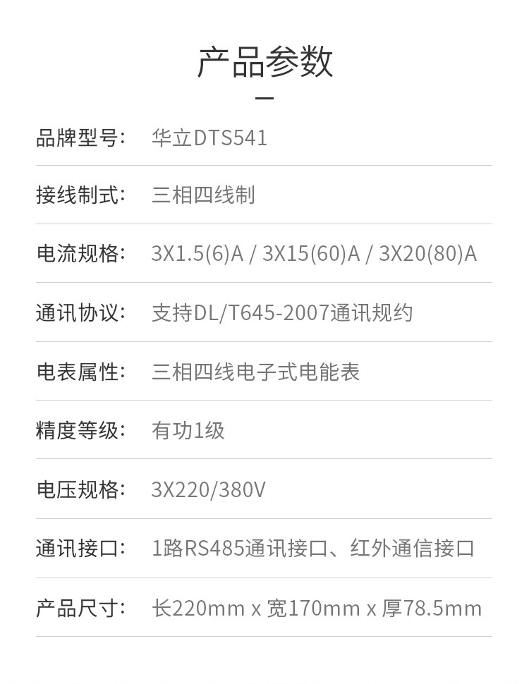 杭州华立DTS541三相四线电子式电能表是国内电表品牌华立研发生产的华立三相四线电能表,该电表具有多种强大功能,如:可测量有功正反向电量,液晶屏显示近3月电量数据,防窃电,配套远程抄表系统和能耗监测系统等功能,让用电实现智能化管理。