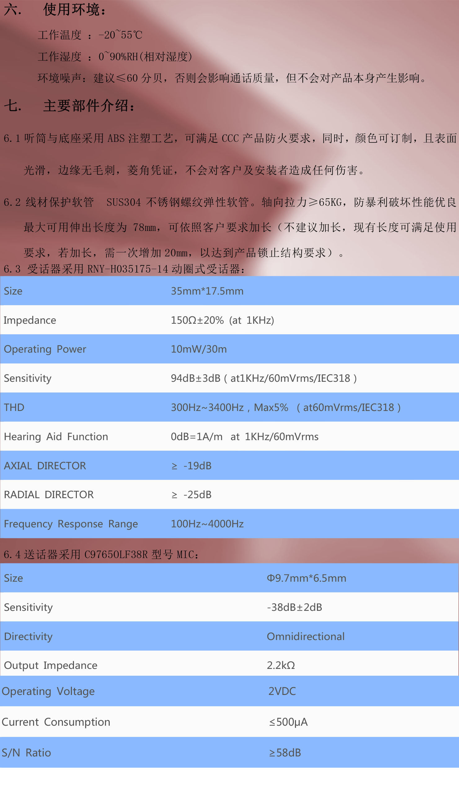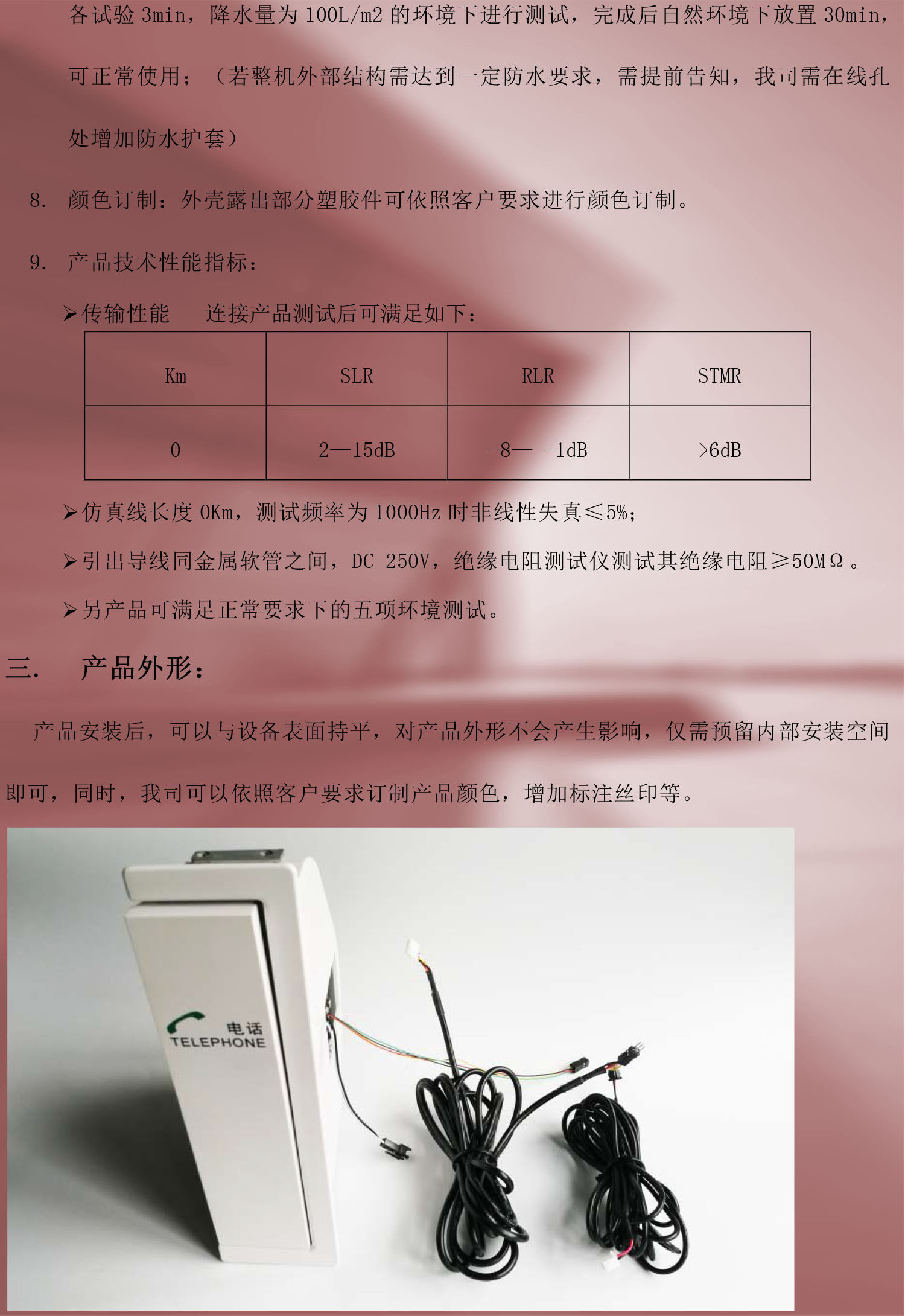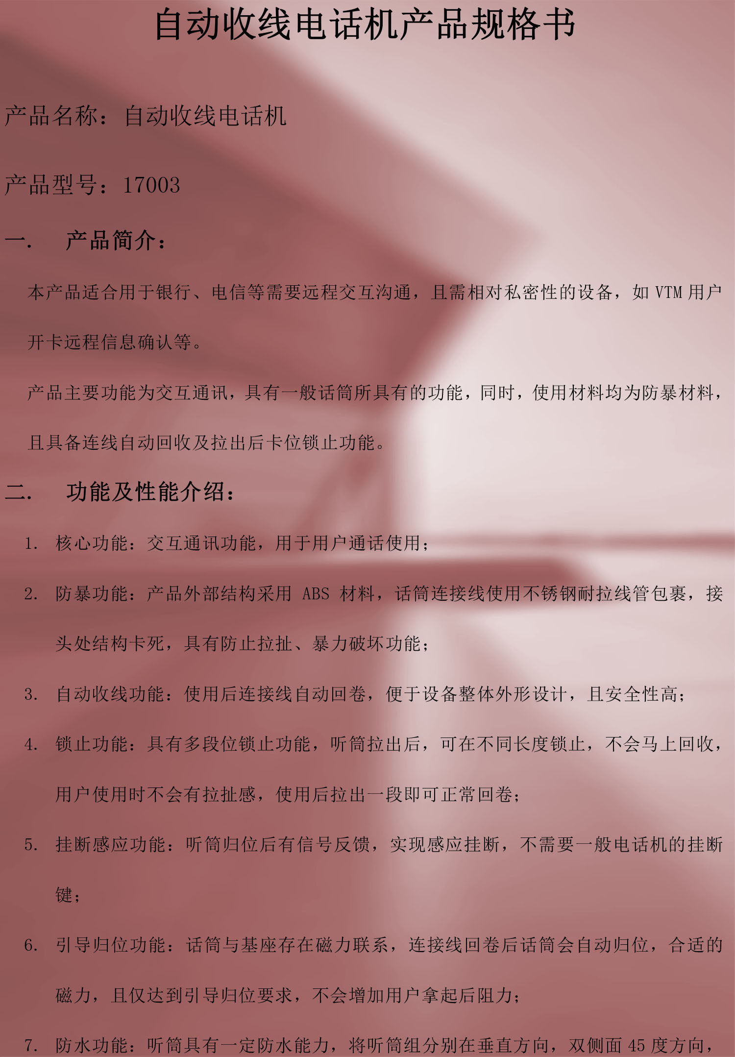 产品主要功能为交互通讯,具有一般话筒所具有的功能,同时,使用材料均为防暴材料,且具备连线自动回收及拉出后卡位锁止功能