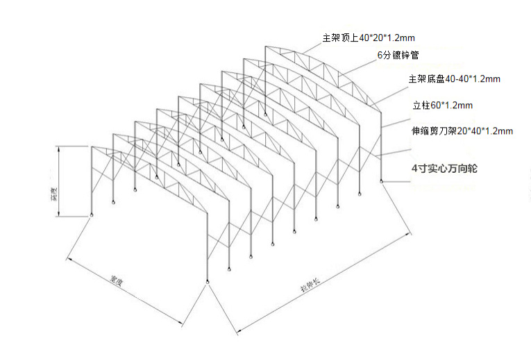 2.立柱伸缩剪刀架:采用40*20MM镀锌扁通,厚度1.2MM;