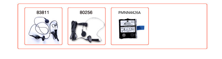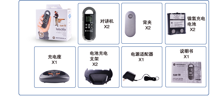 型号:T5产品尺寸:55mm*140mm*30mm ; 产品净重:100克(不含电池) ; 频 率:409~410MHZ ; 功 率:0.5瓦 ;电池类型:AAA碱性电池*4或镍氢充电电池(碱性电池不含在标配内) ; 电池使用时间:4节AAA碱性电池可使用大约16小时/ 镍氢充电电池可使用大约14小时 ;配 件:主机*2(黑色)、背夹*2 、充电底座*1 、电源适配器*1 、镍氢充电电池*2 、 用户手册*1 、 电池支架*2 ;选配耳机型号:80256型VOX耳机、83811 ; 选配电池型号:PMNN4426A ;