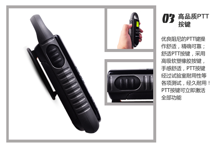 03 高品质PTT按键优良阻尼的PTT键操作舒适,可靠;舒适的PTT按键,采用高级软塑橡胶按键,手感舒适,PTT按键经过实验室耐用性等各项测试,经久耐用!