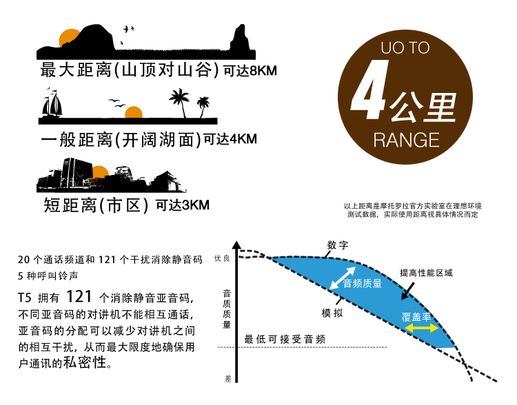 无需话费 无需执照 无需网络 全球通用 绿色环保 20个通话频道和121个干扰消除静音码,5种呼叫铃音,内置免持无线通话,房间监听,定时器,双频道监听,自动关机,支持耳机;