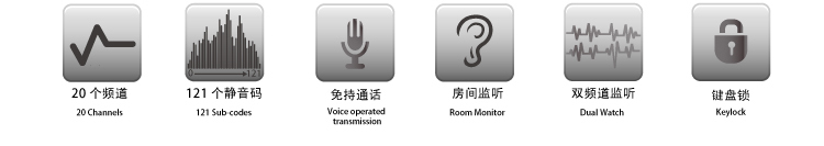 20个通话频道和121个干扰消除静音码5种呼叫铃音内置免持无线通话房间监听定时器双频道监听自动关机支持耳机