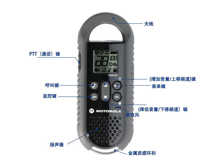 MOTOROLA美国摩托罗拉 T5 民用对讲机MOTO Walkie Talkie,合法使用,绿色健康 ; MOTO Walkie Talkie绿色公众对讲机,可完全解除你的后顾之忧 ! 使用合法:使用公众4.9兆公共频段,节省国家频段资源,无需再申请频率,无频率使用费,免执照,免通话费,无需网络支持,完全符合国家无线使用标准,使用合法 ; 绿色健康:选择对讲机并非功率越大越好,适合的才是重要 !MOTO Walkie Talkie 0.5W功率的对讲机,对人体辐射小,健康符合国家人体安全测试标准,绿色环保,健康之选。