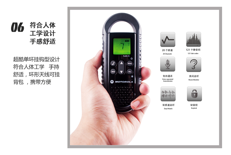 06 符合人体工学设计,手感舒适超酷单环挂钩型设计符合人体工学,手持舒适,环形天线可挂背包 ,携带方便;