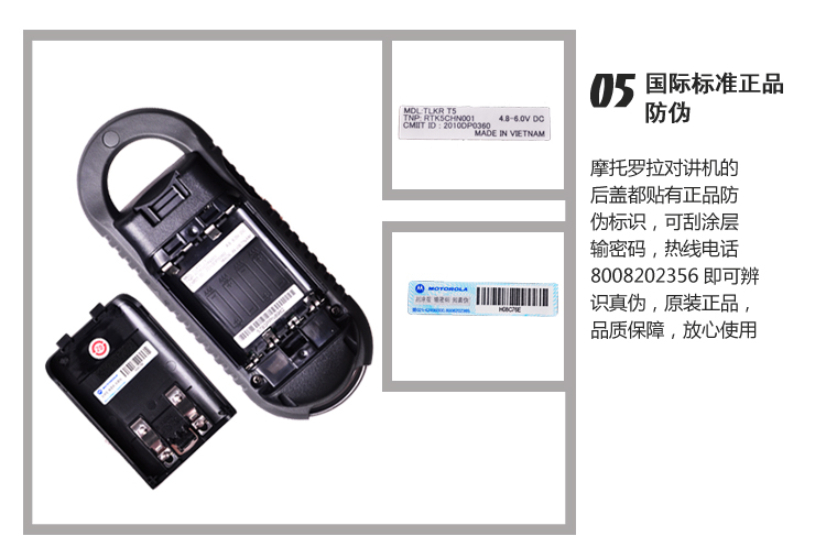05 国际标准防伪摩托罗拉对讲机的后盖贴有防伪标识,可刮涂层输密码,热线电话8008202356即可辨识真伪,原装,品质保障;