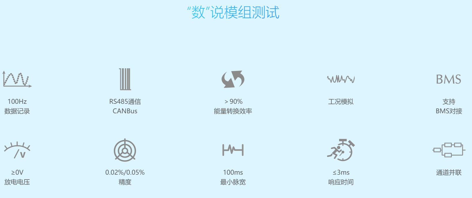CE-6008A-5V100A Module检测系统是专为高功率电池组测试而开发的高精密充放电设备,具有高动态响应速度, 高稳定精度 ,多通道的灵活配置等特点,支持脉冲测试、循环寿命测试、工况模拟测试。 该系统具备 多通道输入及能量回收功能,可节省充放电过程中所消耗的大量电能;采用双向高频直流变换拓扑, 结合高性能多通道 24位AD转换芯片,采样分辨率高于传统单量程设备。