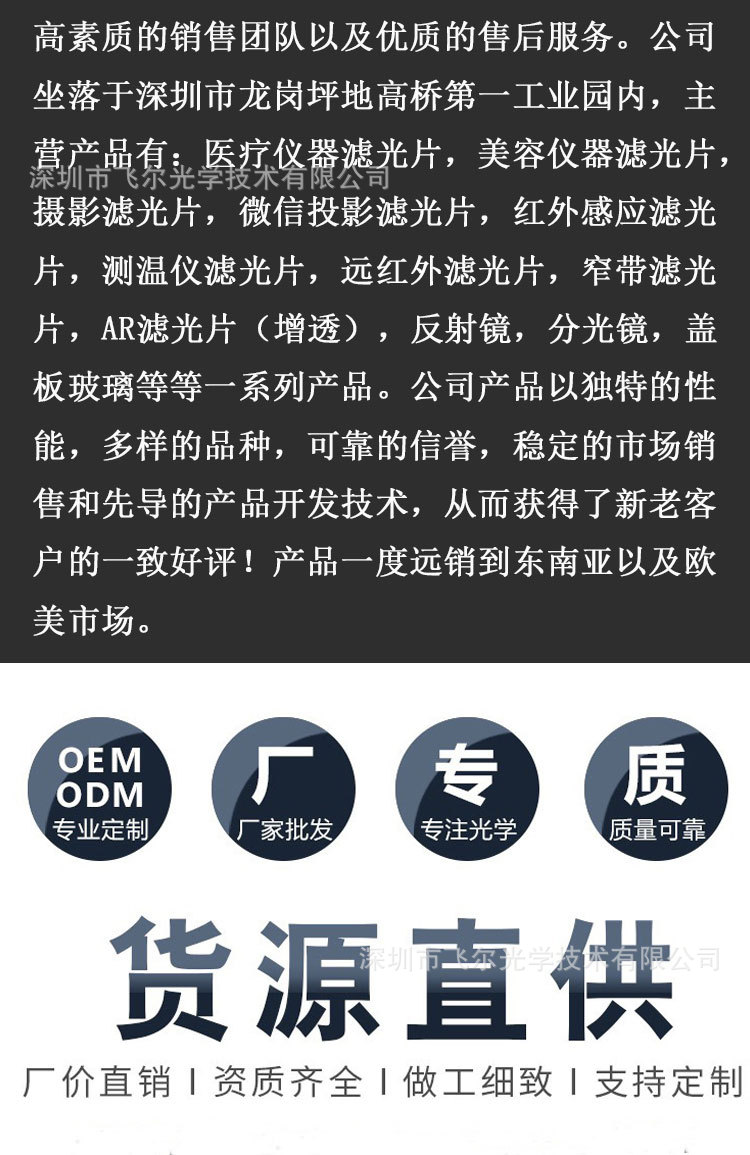 公司所有产品全部采用进口设备镀膜,膜层和波长保证在不同的环境下无任何变化.